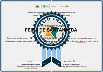 O município de Feira de Santana foi contemplado com o Selo do Fundo Nacional de Assistência Social (FNAS) – edição 2025, reconhecimento concedido às gestões que atendem aos critérios estabelecidos no âmbito financeiro da política pública de assistência social.