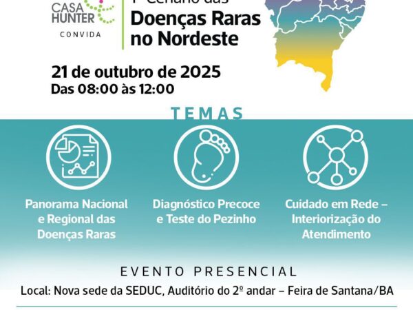 Feira de Santana sediará, pela primeira vez, o “Cenário das Doenças Raras no Nordeste”, no próximo dia 21 de outubro, das 8h às 12h. O evento, promovido pela Casa Hunter, com apoio da Febrararas e Novartis, reunirá especialistas, autoridades, associações, pacientes e familiares para debater os principais avanços e desafios no cuidado de pessoas com doenças raras na região.
